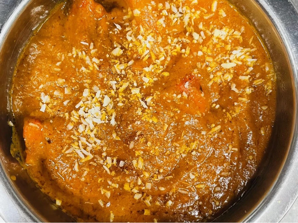 En tjock currysås med mycket lök, paprika. Toppad med rostad lök, koriander