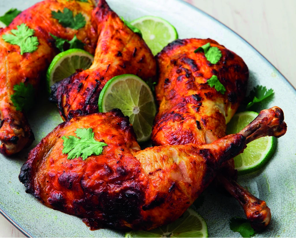 Grillade kycklingfilé marinerad med tandoorikryddor serveras i het sizlar